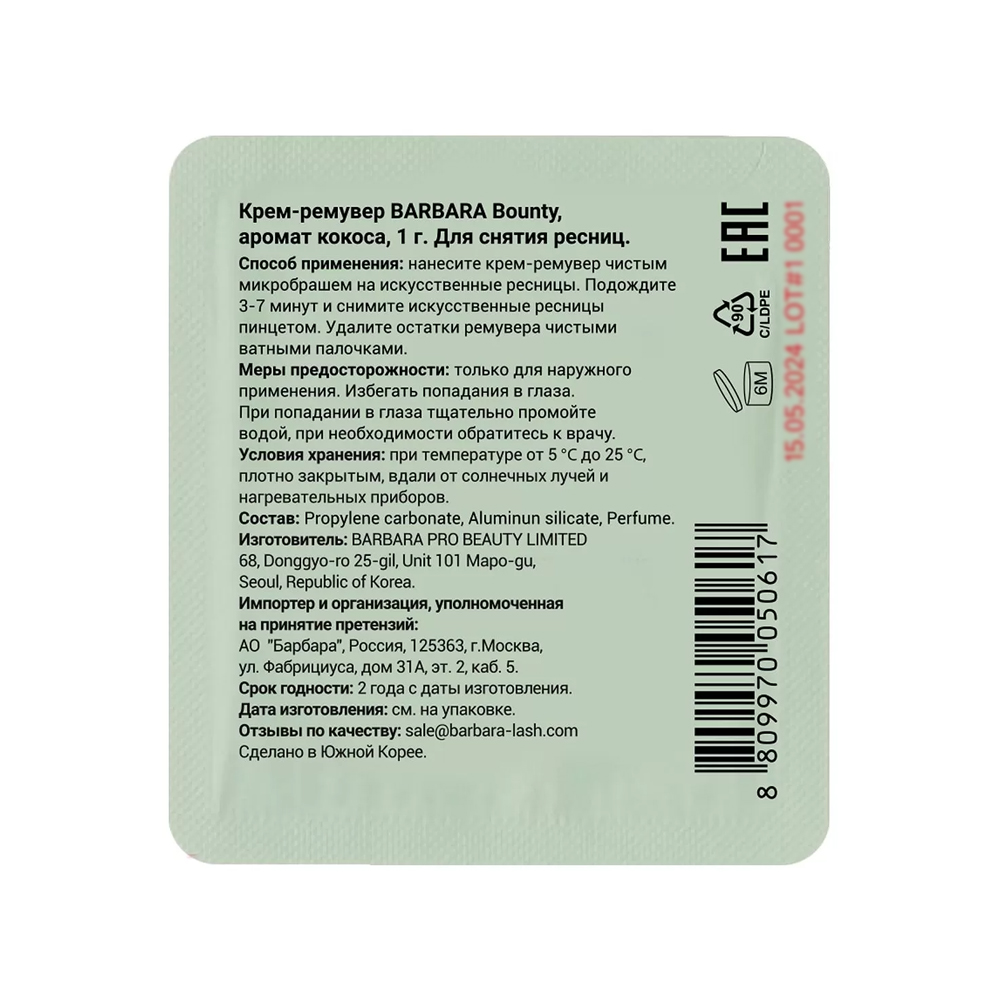 Профессиональный крем-ремувер для снятия наращенных ресниц с ароматом кокоса. Саше объемом 1г.